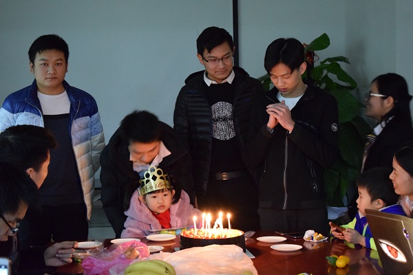 伴隨著悠揚(yáng)動(dòng)聽的歌聲,現(xiàn)場的小伙伴們一起唱響生日歌,笑容掛滿了臉龐,董事長說:“以后每個(gè)月的員工生日會,都務(wù)必舉行,讓所有員工都能切實(shí)感受到自己就是聚力的家人?!鄙諘?,大家一起唱生日歌,壽星們一起許下了2017年的生日愿望,溫馨和諧的氣氛,讓大家感受到了“家”的溫暖,此時(shí)此刻,所有的快樂與力量都凝聚在了一起,增強(qiáng)了團(tuán)員的凝聚力、向心力和歸屬感。