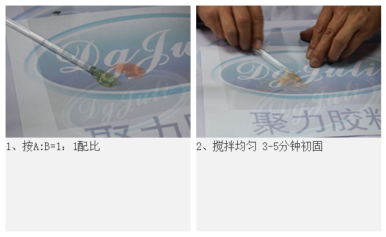 2、AB膠使用時將A、B組分按1:1比例混合攪拌均勻,涂于被粘物表面,