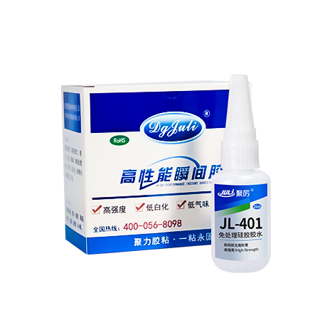 聚厲牌JL-401免處理瞬間膠主要成份氰基丙稀酸酯, 符合環(huán)保標(biāo)準(zhǔn),已通過歐盟ROHS標(biāo)準(zhǔn)和SGS檢測,施工便利。非常適合連續(xù)化生產(chǎn)線作業(yè)。這款硅膠瞬間膠水具有透明度好,強度高、性能好、粘接力強柔韌性好不脆等特點。針對特殊硅膠材質(zhì),無需處理表面即可粘合,適用于硅膠粘硅膠,硅膠粘其他的材質(zhì)等。