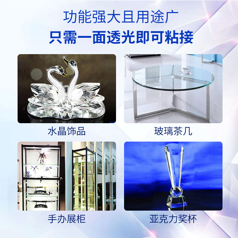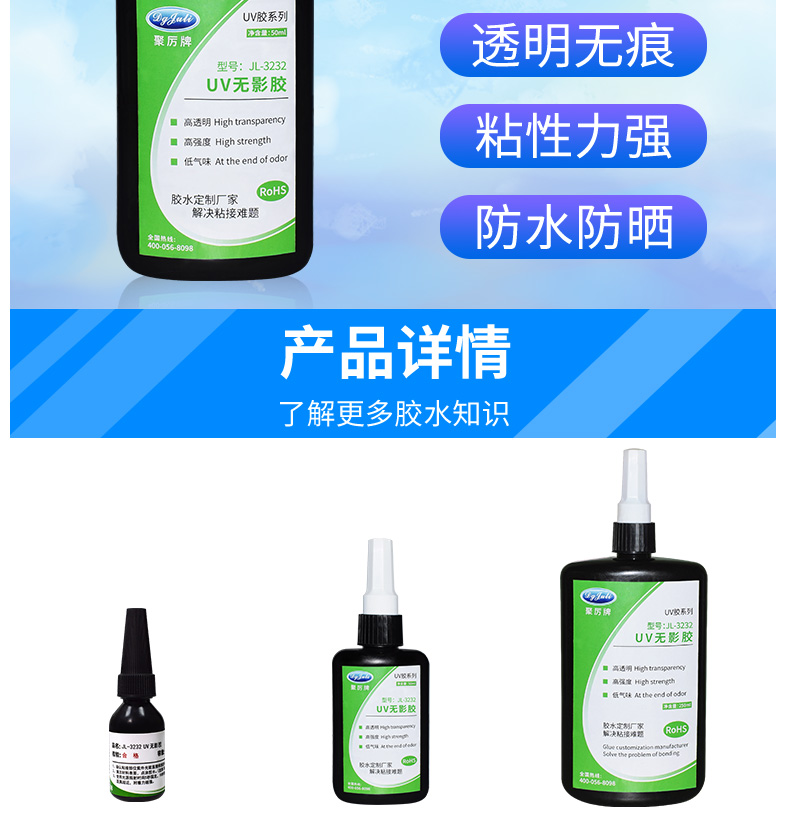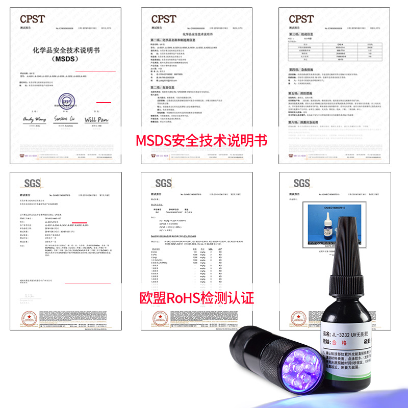 聚厲牌JL-3232UV無影膠水為單組分uv光固化改性丙烯酸樹脂結(jié)構(gòu)膠,本品具有氣味低固化快、粘接強(qiáng)度適中、固化后膠層無色適明、韌性高,體積收縮率小耐沖擊力、 耐黃變耐冷熱性優(yōu)異。廣泛應(yīng)用于水晶,玻璃,茶幾,玻璃,金屬,透明塑料,亞克力等材質(zhì)。