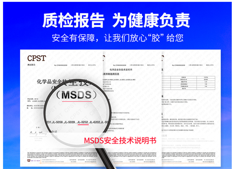 4、請儲(chǔ)存在陰涼避光地方,打開瓶蓋后請蓋好瓶蓋未用完膠液不可倒回原包裝瓶。儲(chǔ)存溫度在8-30℃,過高或過低都會(huì)影響膠液性能保質(zhì)期為12個(gè)月。