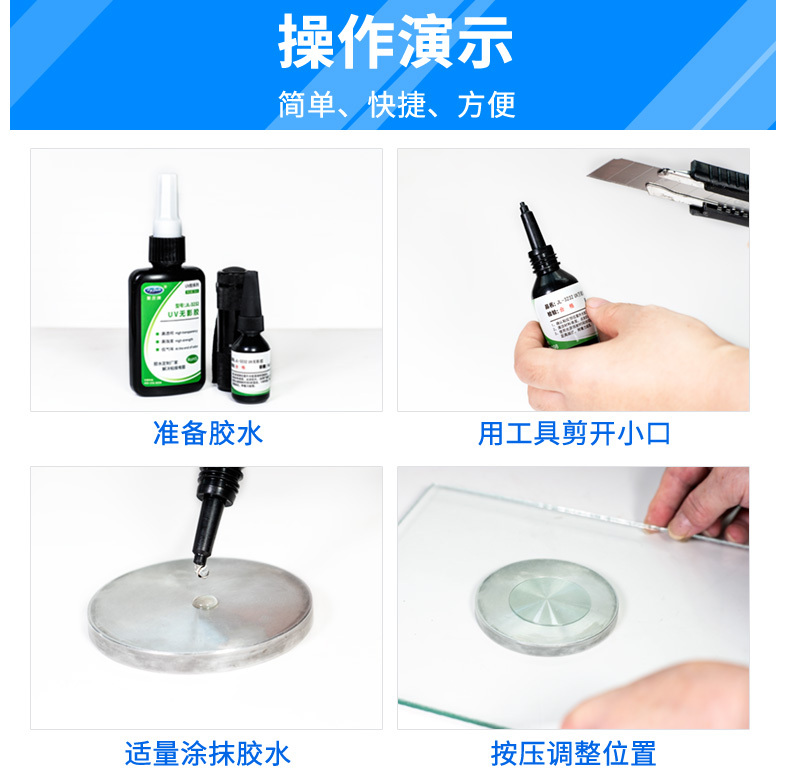3、聚厲牌JL-3231塑料專用UV無影膠在使用之前請稍微搖動(dòng)在被黏塑料以表面均勻涂抹UV膠水,并馬上把黏結(jié)面對準(zhǔn)粘合到一起并壓實(shí)用專用UV燈照射60-120秒左右即可達(dá)到高強(qiáng)度。