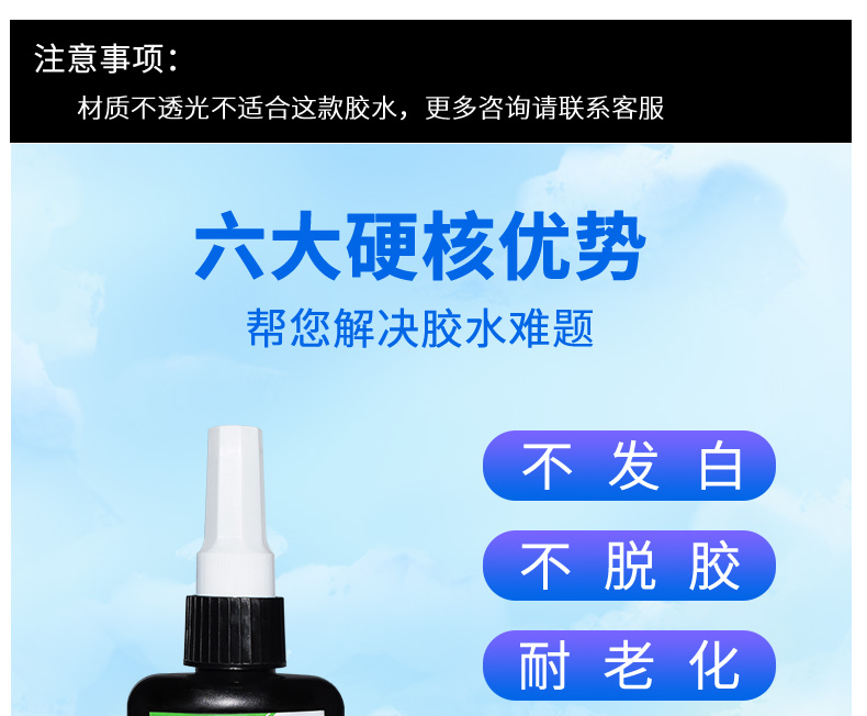 2、聚厲牌水晶UV膠水為化學(xué)品產(chǎn)品,請遠(yuǎn)離兒童、遠(yuǎn)離火源、熱源,室溫及陰涼處通風(fēng)儲(chǔ)存,禁止與氧化劑、酸、堿類化學(xué)品混放避免讓未固化的膠長時(shí)間接觸皮膚。